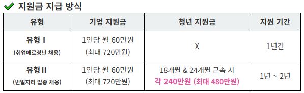 -청년 지원금: 청년에게는 최대 480만원의 지원금이 제공됩니다. 이는 청년의 취업 애로 유형에 따라 달라질 수 있습니다.