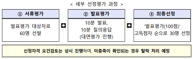 ◦ (선정방법) 평가위원 최고점, 최저점을 제외한 산술평균 기준으로 70점 이상인 자 중 고득점자 순으로 30명(팀) 선정 - 동점자 발생시, 소수 둘째자리까지 비교하여 고득점자 순으로 선정하며, 추가 발생시 평가지표(창업아이템 기술성 및 차별성, 보완가능성, 20점) 항목 점수를 비교하여 고득점자 선정