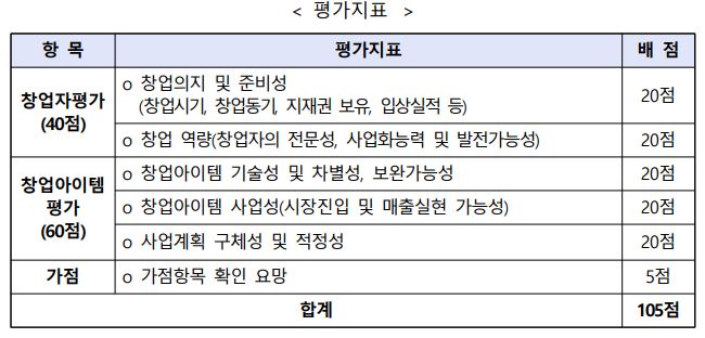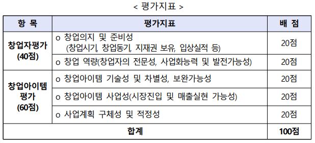 - 동점자 발생시, 소수 둘째자리까지 비교하여 고득점자 순으로 선정하며, 추가 발생시 평가지표(창업아이템 기술성 및 차별성, 보완가능성, 20점) 항목 점수를 비교하여 고득점자 선정