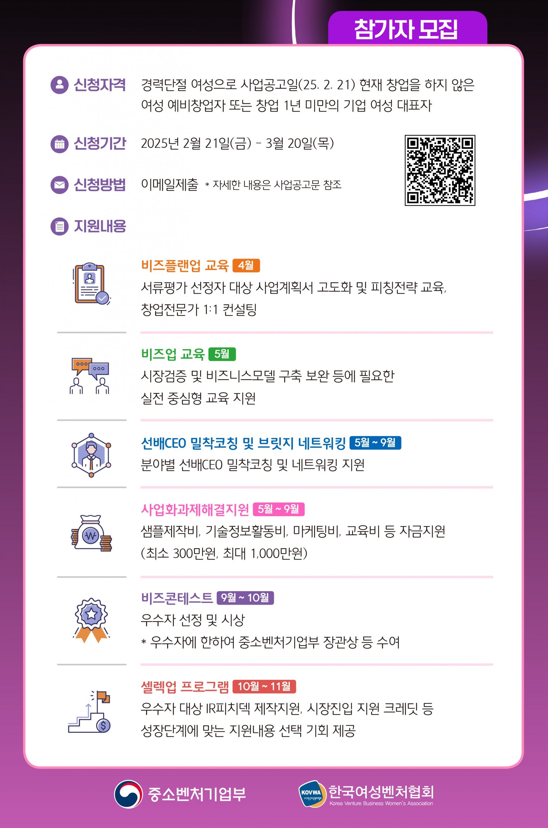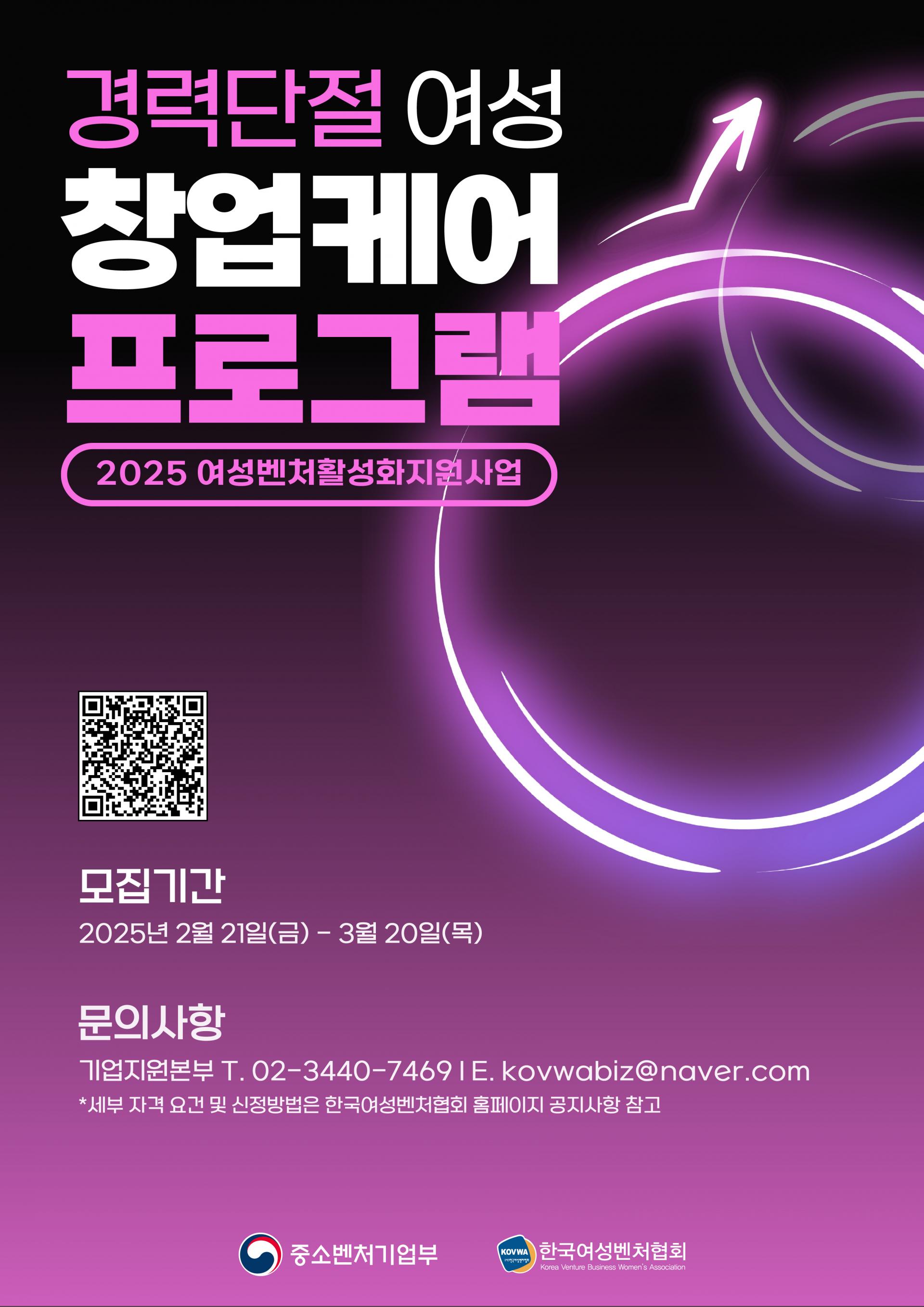 ◦ 신청자격 : 경력단절 여성으로 사업 공고일(25.02.21) 현재 창업을 하지 않은 여성 예비창업자 또는 창업 1년 미만의 기업 여성 대표자
