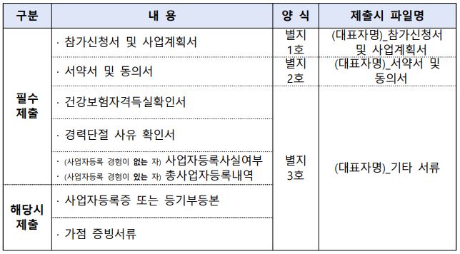 ◦ 모든 서류는 PDF 파일 변환 후 폴더로 압축하여 이메일 제출 (폴더명 : 대표자명_창업케어)