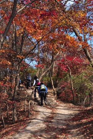 단풍구경을 하기위해 꼭 지방에 있는 산으로 갈 필요는 없다. 도심 속에도 단풍을 즐길 수 있는 곳이 제법 있다. 그중에 하나가 인왕산과 북악산 하늘길을 따라가는 코스이다. 도심 속 깊은 숲길도 체험할 수 있고, 단풍나무가 많아 유독 붉은빛을 많이 발하는 곳이다. 걷는 중간에 빠져나가기도 용이하고 걷고 싶은 만큼 걸을 수 있다. 단, 북악산 하늘길 부암동을 지나쳤다면 무조건 끝까지 가야 한다. 하늘길 중간 팔각정은 쉼터이자 서울 중심을 내려다볼 수 있는 전망대이다. 얼룩덜룩 물든 북한산 자락에 얹혀있는 평창동 마을을 보는 것도 여기서만 느낄 수 있는 풍경이다. 다양한 집 모양새가 만든 한 폭에 그림이다.