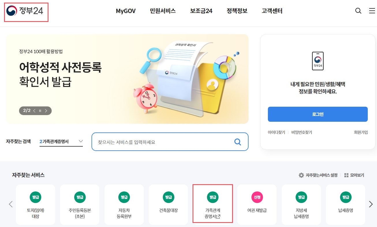 먼저 "정부24 홈페이지"를 찾아 들어갑니다. 중앙에 위치한 "자주찾는 서비스"에서 "가족관계증명서"를 클릭합니다.