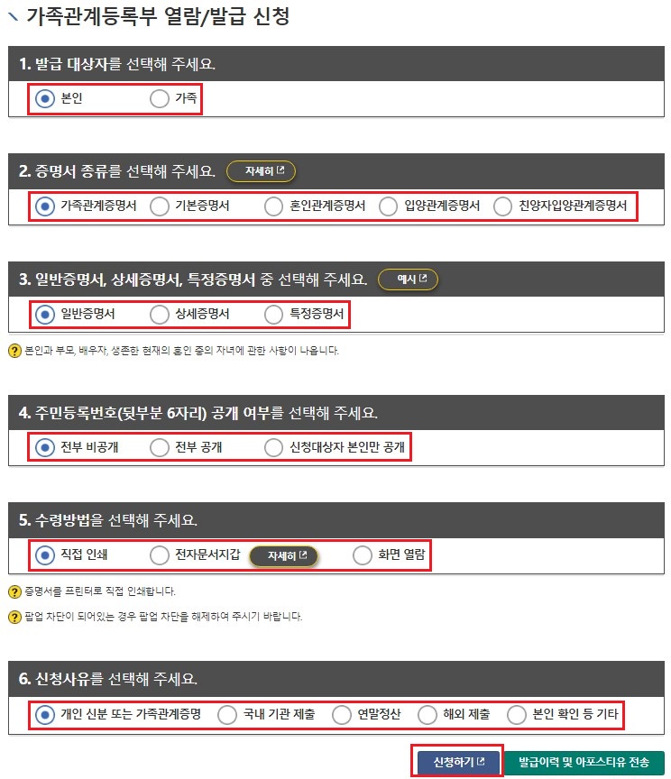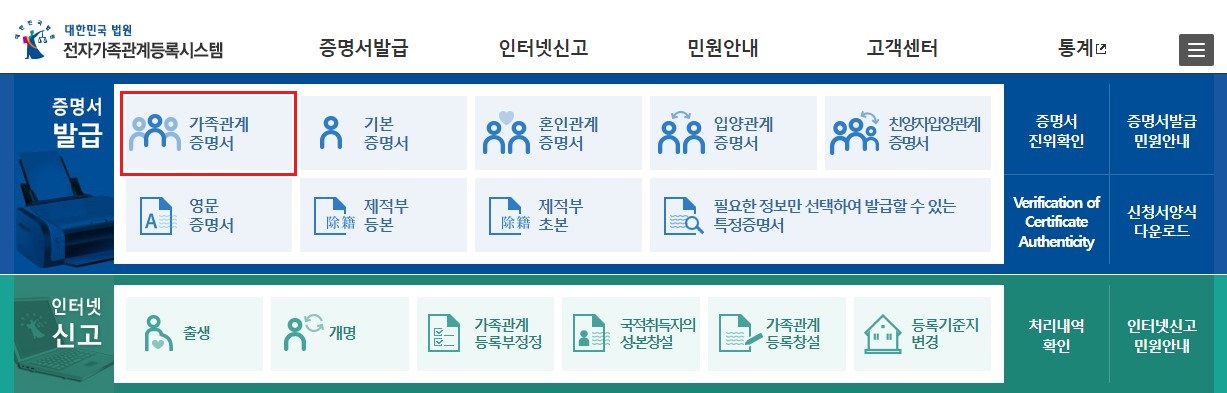 두 번째 증명서 종류는 가족관계증명서를 선택하시고