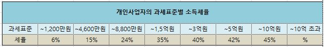 개인사업자의 경우, 법인사업자에 비해 최저세율은 낮지만 최고세율이 높습니다.