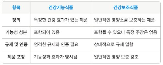 규제: 건강기능식품보다 상대적으로 규제가 덜하며, 특정한 인증 절차가 필요하지 않을 수 있습니다.