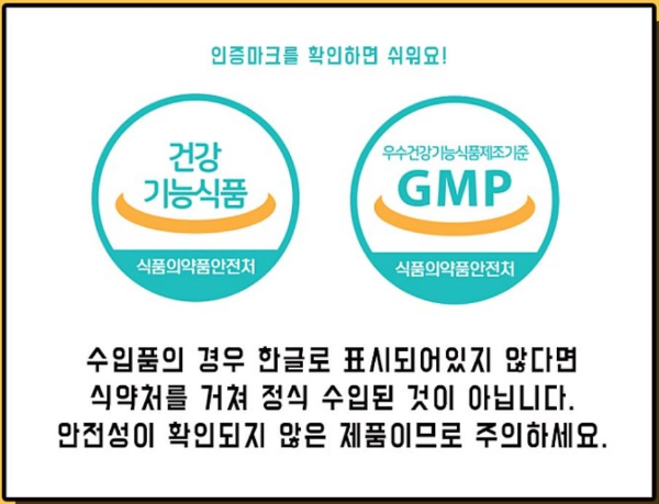 건강보조식품은 의약품이 아닙니다. 건강기능식품은 식품의약품안전처의 인증을 확인해야 합니다. 제품 포장에 "건강기능식품"이란 표기가 없다면 식품의약품안전청에서 인정한 것이 아니라고 보면 됩니다.