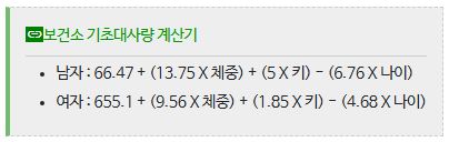위 식은 기초대사량을 구하는 공식중 제일 일반적으로 쓰이는 해리스-베네딕트 식이다. 사람의 나이와 키, 체중을 통해 기초대사량을 측정하는 방식으로, 사람의 체질이나 병세같은 변수를 고려하지 않지만, 단순하면서도 오차범위가 크지 않은 편이다.