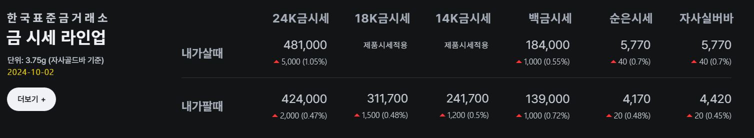 10월 3일 0시 기준 한국표준거래소에 따르면 순금시세는 살때 481,000원이고, 팔 때는 424,000원이다고 명시했습니다.