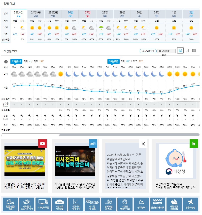 중기예보 : 대략적 일주일 분량의 날씨를 확인할 수 있습니다.