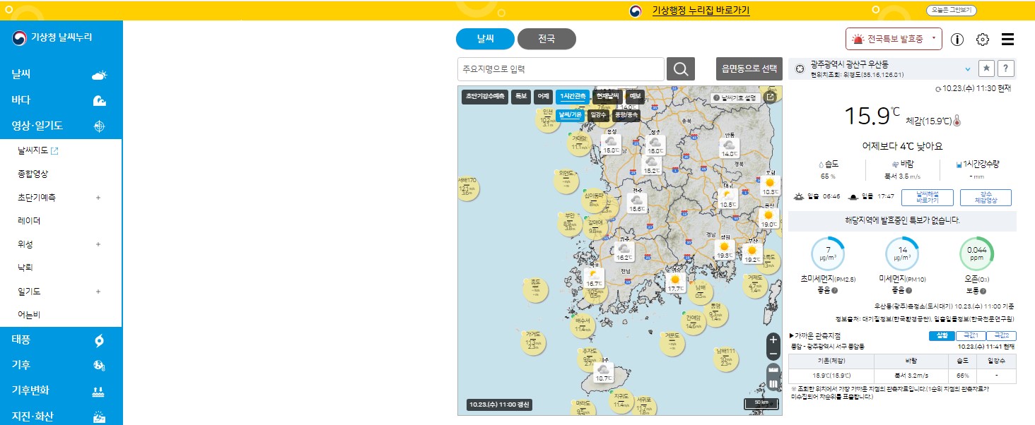 좌측에 사이드바 메뉴에서는 기상에 관한 여러가지 주제들에 대해 설명과 실제 상황들을 확인 할 수 있도록 잘 열거해 놨습니다.