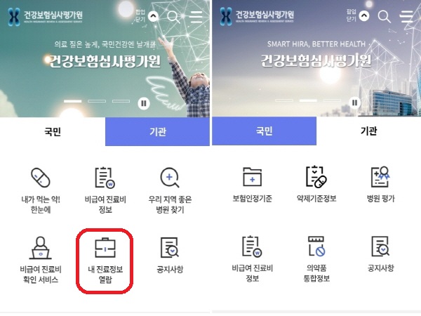 진료정보 열람 메뉴 선택: '내 진료정보 열람' 또는 '내 정보 조회' 메뉴를 찾아 클릭' 개인정보 수집 동의 및 본 인인증'을 합니다.