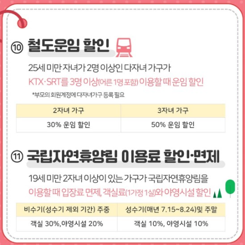 KTX·SRT의 경우 25세 미만 자녀가 2인 이상인 가구는 어른 운임의 30%, 3자녀 가구는 어른 운임의 50%를 할인받을 수 있습니다. 어른 1명을 포함하여 3명 이상 이용 시 할인받을 수 있으며, 레츠코레일과 SR 누리집에 접속하여 가구 중 어른 1명의 회원권에 다자녀 가정임을 인증하면 혜택을 이용할 수 있습니다.