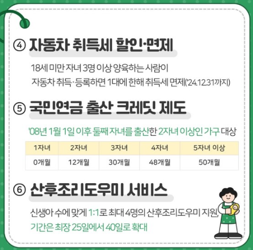 18세 미만의 자녀를 3명 이상 양육하는 사람이 양육을 목적으로 2024년 12월 31일까지 자동차를 취득하여 등록하는 경우 1대에 한하여 취득세를 면제받을 수 있게 됐습니다.