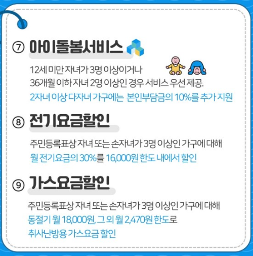주민등록표상 자녀 또는 손자녀가 3명 이상인 가구는 동절기(12월~3월)의 경우 월 18,000원, 그 외 월 2,470원의 한도로 취사난방용 도시가스 요금을 할인받을 수 있습니다. 거주지의 도시가스회사나 주민센터를 통해 신청할 수 있습니다.