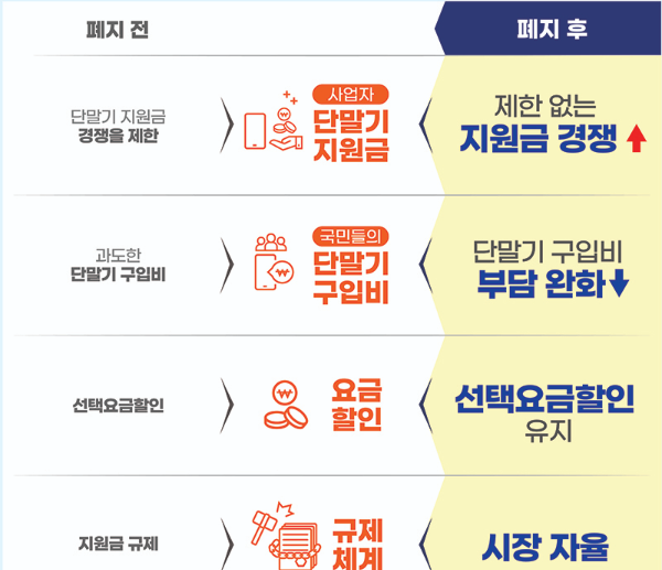 -지원금 공시의무 및 추가지원금 상한 폐지: 이동통신사의 단말기 지원금 공시의무와 유통점의 추가지원금 상한이 폐지되어, 사업자 간 지원금 경쟁이 활성화될 수 있는 여건이 조성됩니다.