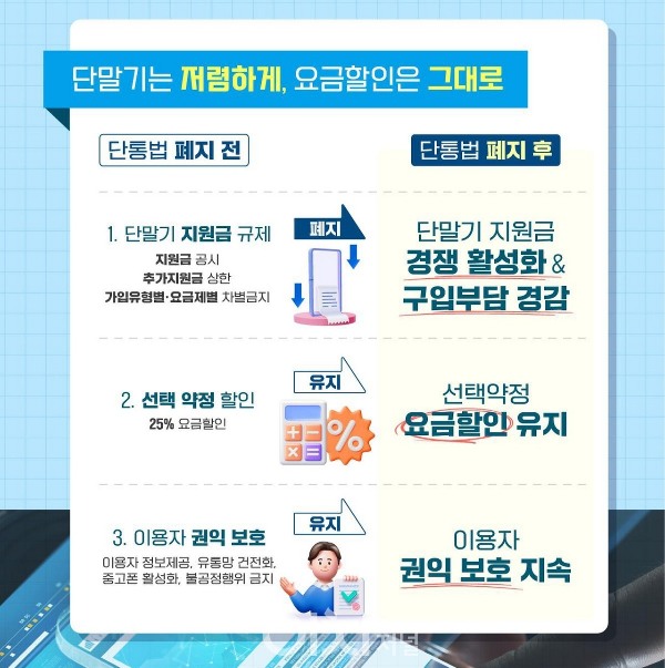 -부당한 지원금 차별 금지 규정 삭제: 가입유형 및 요금제에 따른 부당한 지원금 차별을 금지하는 규정이 사라져, 사업자가 이용자에게 다양한 혜택을 제공할 수 있는 판촉 전략이 가능해집니다.
