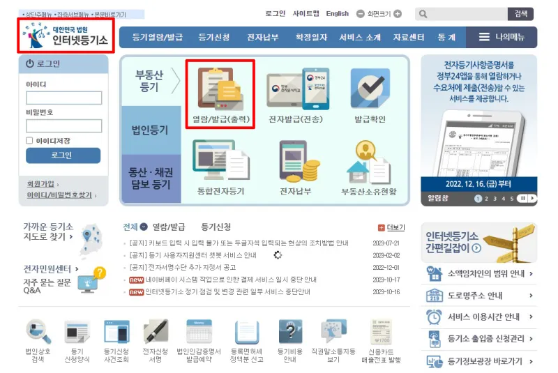 인터넷 등기소 홈페이지 > 부동산 등기 > 열람/발급(출력) 페이지에서 확인하실 수 있어요.