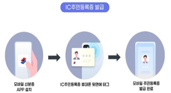 모바일 신분증 앱 설치 → IC주민등록증 휴대폰 뒷면에 태그 → 모바일 주민등록증 발급 완료