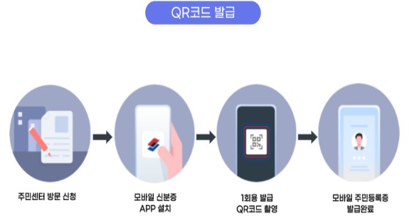 주민센터 방문 신청 → 모바일 신분증 앱 설치 → 1회용 발급 QR코드 촬영 → 모바일 주민등록증 발급 완료