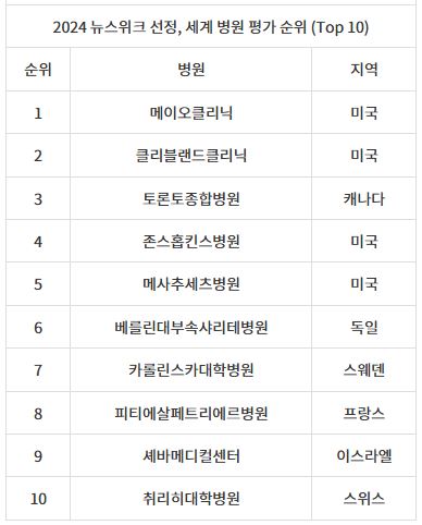 세계 순위 1~10위 병원