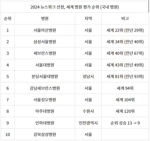 안녕하세요! 메이킹맨입니다. 2024년 뉴스위크가 발표한 세계 병원 평가에서 한국의 병원들이 높은 순위를 차지했습니다. 이번 순위는 전 세계의 다양한 병원들을 대상으로 한 평가로, 의료 서비스의 질, 환자 안전, 혁신적인 치료 방법 등을 기준으로 하여 선정되었습니다. 이번에 발표된 세계순위를 근거로 2024년 국내 순위를 정리해 보았습니다.
