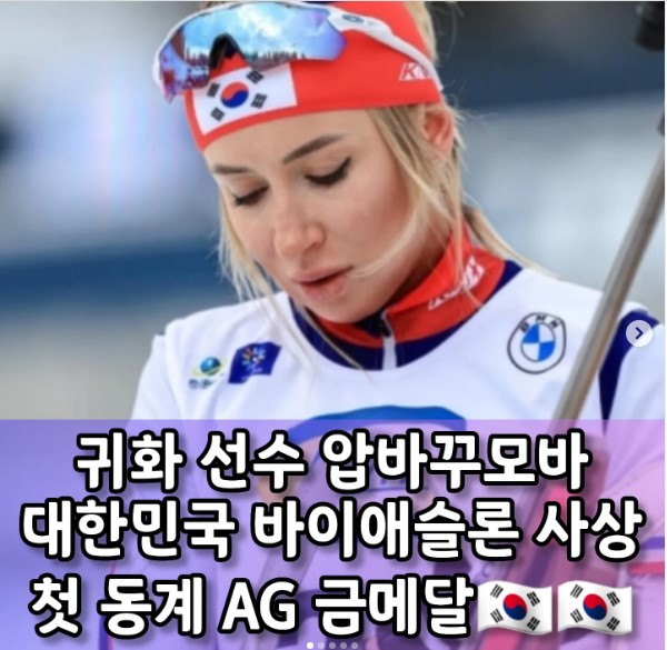 기쁜소식입니다. 11일 중국 헤이룽장성 하얼빈 상즈시 야부리 스키 리조트에서 열린 2025 하얼빈 동계 아시안 게임 여자 바이애슬론 7.5km 스프린트 종목에서 예카테리나 아바쿠모바(전남체육회)가 금메달을 따냈다.