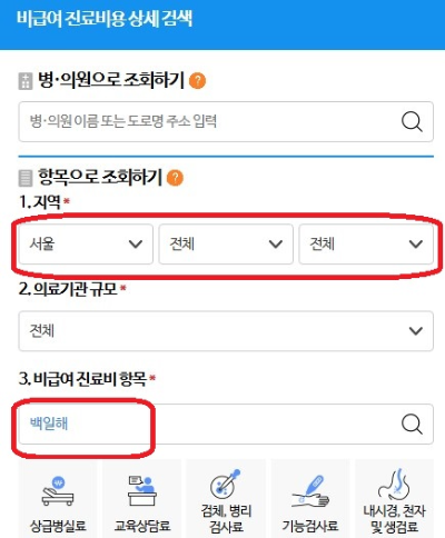 2. 비급여 진료비용 정보 클릭!! 비급여 진료비용 상세 검색 (지역 ㅡ> 의료기관 규모 ㅡ> 비급여 진료비 항목 : '백일해' 입력)