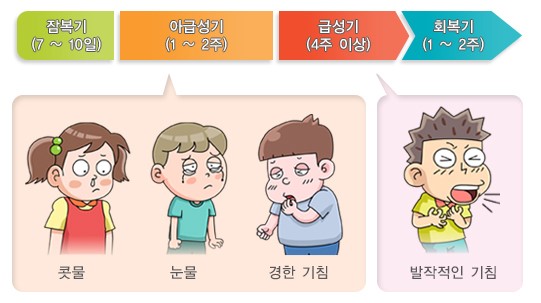 평균 7~10일(4~21일)의 잠복기 후 콧물, 눈물, 경한 기침 등의 상기도 감염 증상이 1~2주간 지속됩니다. 이후 4주 또는 그 이상 발작적인 기침이 나타나는데, 기침 후 구토를 동반하기도 합니다. 그후 1~2주에 걸쳐 회복되는데 이때 상기도 감염이 겹쳐 다시 발작성 기침이 재발하기도 합니다.