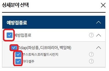 3. 상세분야 선택 : 예방접종료 Tdap 선택 후 ㅡ> 선택항목 적용 클릭!!
