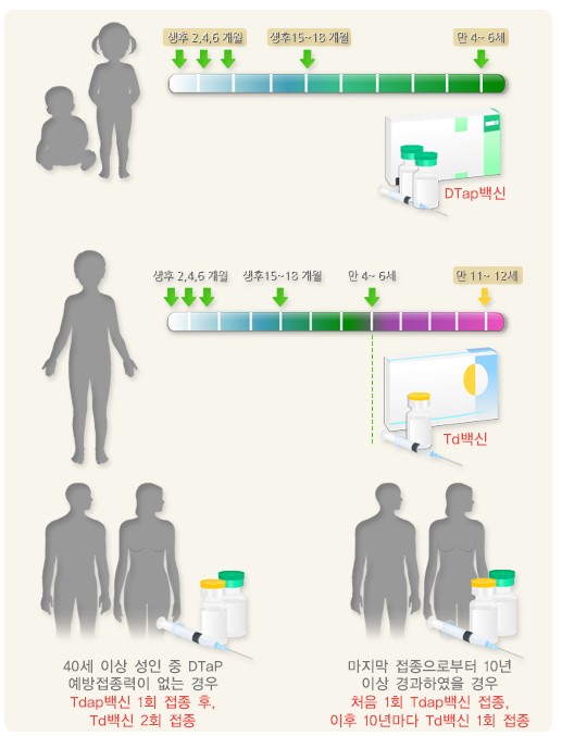 모든 영유아에게 DTaP 백신을 생후 2개월부터 2개월 간격으로 3회 기초 접종하고, 생후 15~18개월, 만 4~6세에 추가 접종하며, TdaP 혹은 Td 백신으로 만 11~12세에 추가 접종합니다.