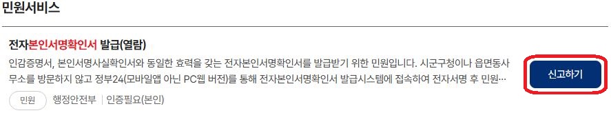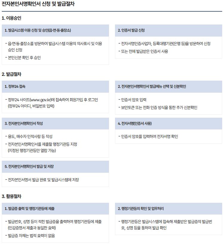 전자본인서명확인서는 인감증명서, 본인서명사실확인서와 동일한 효력을 갖는 전자본인서명확인서를 발급받기 위한 민원입니다. 시군구청이나 읍면동사무소를 방문하지 않고 정부 24(모바일앱24( 아닌 PC웹 버전)를 통해 전자본인서명확인서 발급시스템에 접속하여 전자서명 후 민원인 직접 발급 출력하는 제도입니다.