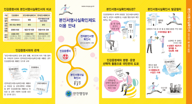 인감증명제도와 효력이 동일한 "본인서명사실확인제도"는 본인이 서명했다는 사실을 행정기관이 확인 해주는 제도로서 인감증명제와 병행. 운영. 선택적 활용으로 국민편의 도모하기 위한 제도입니다.