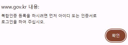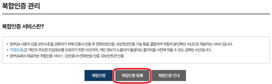 복합인증 등록을 하려면 반드시 아이디나 인증서를 통한 로그인이 되어야 합니다. 로그인을 하시고 등록 작업을 계속하시면 됩니다.