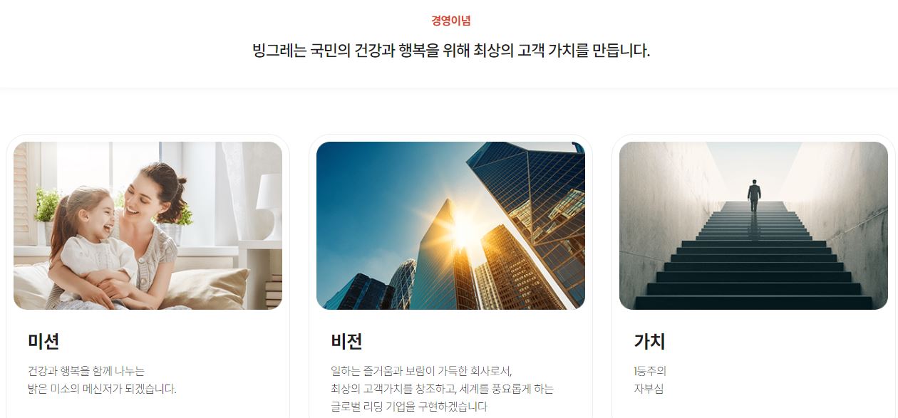 건강과 행복: 빙그레는 소비자들의 건강과 행복을 최우선으로 생각하며, 이를 위해 지속적으로 품질 높은 제품을 개발하고 있습니다.