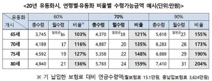 유동화된 사망보험금은 **전액 유동화가 아닌 최대 90%**의 부분 유동화 방식으로 운영됩니다. 예를 들어, **보험금 90%**를 20년간 수령하는 형태로 지급됩니다. 또한, 신청 자격은 만 65세 이상 계약자라면 누구나 가능합니다.