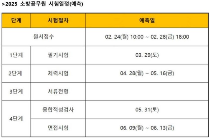 구체적인 일정은 25년 1월경 소방공무원 채용인원과 구체적인 계획 및 시험 일자가 공개될 것으로 보입니다.