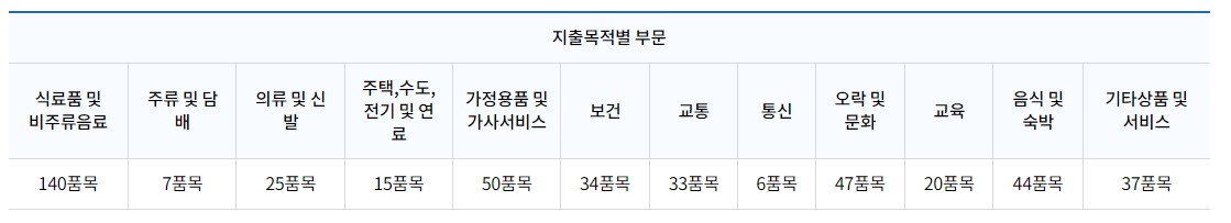 대표품목은 소비자의 구입목적에 따라 다음과 같은 12개 대분류로 구분될 수 있습니다.