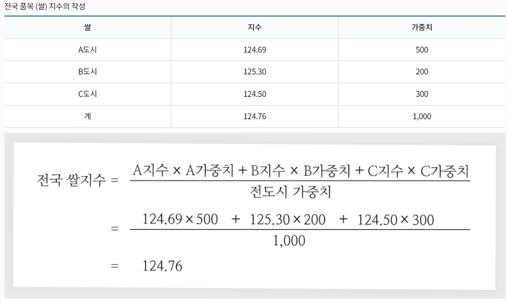 도시별로 품목 지수(비교시점 가격/기준시점 가격)를 먼저 작성하고 각 품목의 도시별 가중치를 적용하여 전국 품목 지수를 작성합니다. 그다음 전국의 품목 지수에 품목별 가중치를 적용하여 전국 소비자 물가지수를 산출합니다.