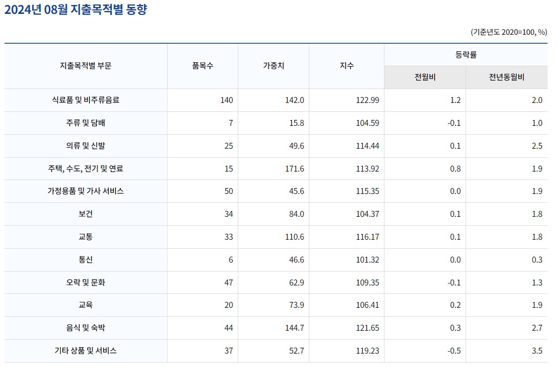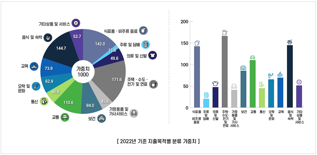 통계청은 2023년 12월 19일, 과거 2020년 기준 가중치를 2022년 기준으로 변경하였습니다. 따라서 2022년 1월부터 현재까지 사용하고 있는 가중치는 기준연도가 2022년이며, 지출목적별 분류 가중치는 다음과 같습니다.