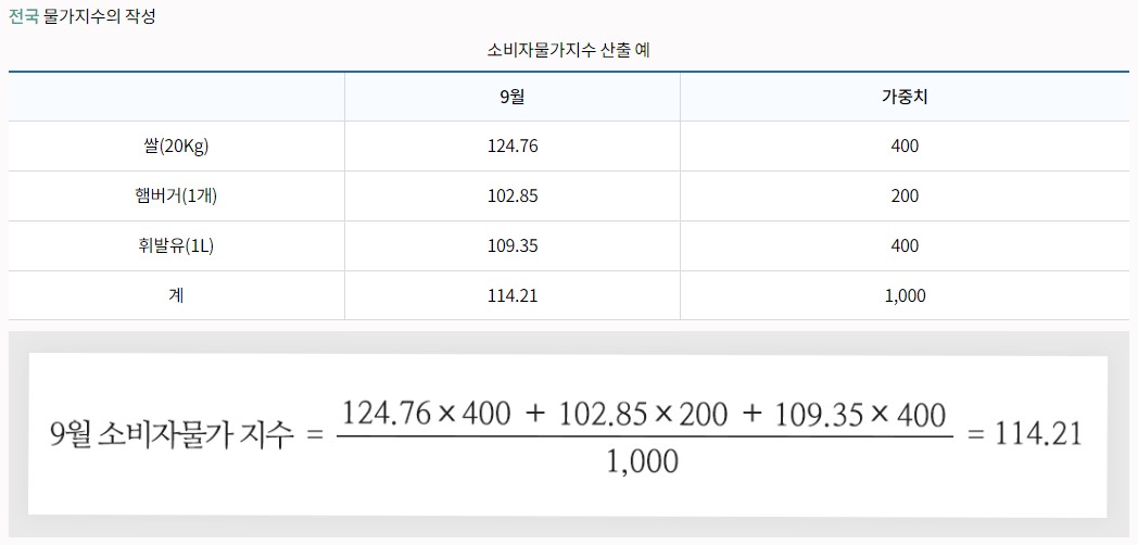 가중치는 통계청의 “가계동향조사”에서 나오는 우리나라 가구의 소비지출구조에서 얻어집니다.