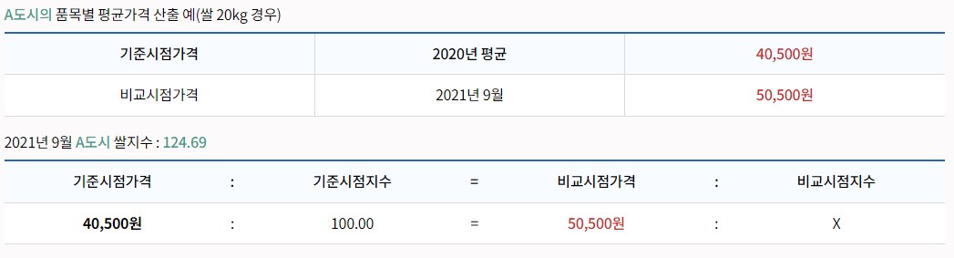 개별 도시 내에서의 품목 지수는 단순하게 작성됩니다. 각 품목의 기준시점의 가격과 대비한 비교시점의 가격이 품목 지수입니다. 아래에서 2020년 쌀(20kg) 평균 가격이 40,500원일 때 2021년 9월 가격이 50,500원이면, 2021년 9월 A도시의 쌀지수는 (50,500/40,500)*100=124.69이 됩니다.