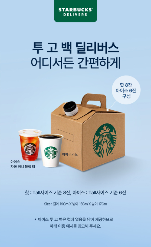 스타벅스의 투 고 백 딜리버스 서비스로 언제 어디서나 간편하게 스타벅스 음료를 즐길 수 있습니다.