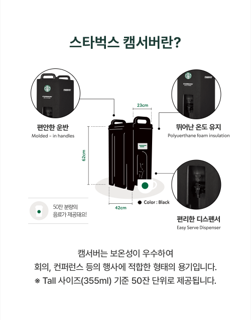 용량: 50잔 분량의 음료를 제공하는 캠서버로, 회의나 콘퍼런스에 적합합니다.