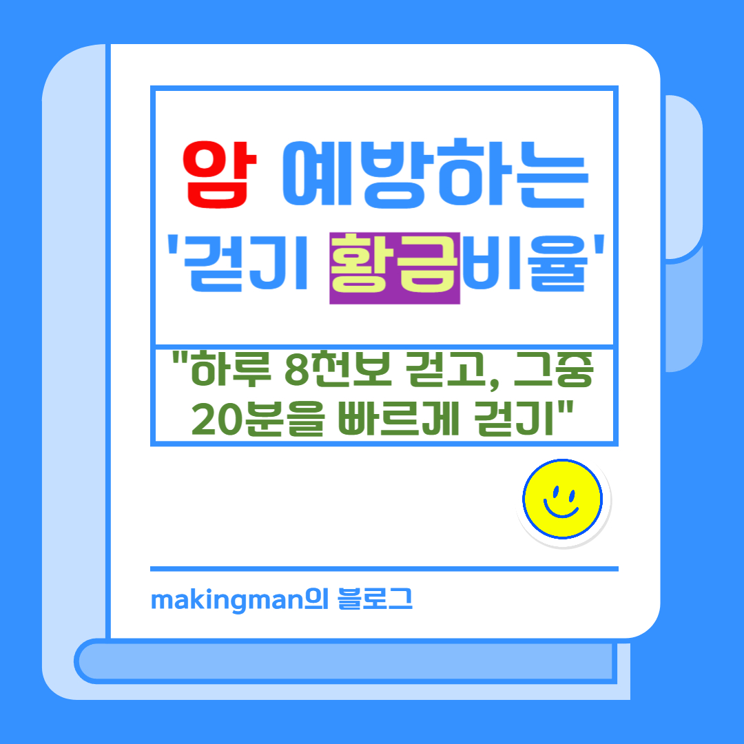안녕하세요! 메이킹맨입니다. 최근 발표된 연구 결과에 따르면, "하루 8000보를 걷고, 그중 20분을 빠르게 걸으면 거의 모든 질병을 예방할 수 있다"는 놀라운 사실이 밝혀졌습니다. 이 놀라운 연구 결과는 일본 도쿄 도립 건강장수 의료센터 노화제어 연구팀의 20년에 걸친 조사에서 밝혀졌습니다. 이 연구는 ‘걷기 황금 비율’로 불리며, 건강 정보 관련 매체에서 큰 주목을 받고 있습니다. 이 연구는 걷기가 단순한 운동을 넘어 우리 몸과 마음에 미치는 긍정적인 영향을 입증하고 있습니다. 현대 사회에서 많은 사람들이 앉아있는 시간이 길어지면서 건강 문제가 증가하고 있는 가운데, 걷기가 얼마나 중요한지 다시금 상기시켜 줍니다. 이전에도 "매일 1만 걸음을 걸으면 여성은 4.6년, 남성은 4.1년이 젊어지는 효과를 얻을 수 있다." 라는 연구결과도 있었는데요. 1만 걸음은 대략 5~7km로 매일 빠른 걸음으로 1시간 정도 걸으면 된다. 이번 포스팅에서는 이 연구 결과를 바탕으로 걷기의 건강 효과와 실생활에서 적용할 수 있는 방법들을 살펴보겠습니다. 여러분도 하루 8000보의 힘을 통해 더 건강한 삶을 만들어보세요!