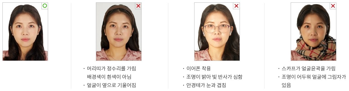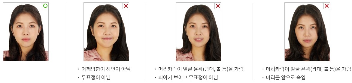 머리카락으로 눈을 가려서는 안되며, 얼굴 전체(이마~턱, 얼굴 윤곽 등)가 완전히 노출되어야 함