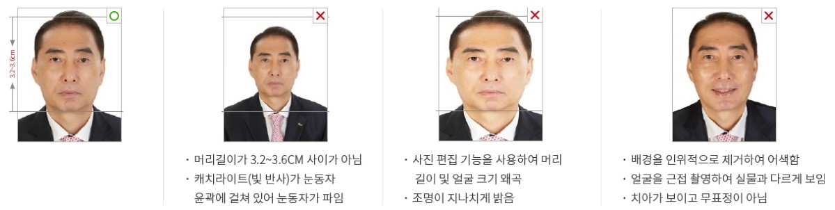 본인이 직접 촬영한 사진은 여권사진 규격에 적합한 경우에만 사용 가능함
