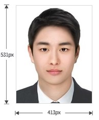 - 온라인 신청용 여권사진은 가로 413 X 세로 531 pixel 규격을 권장하며 사진 인화 시 머리 길이가 3.2~3.6cm 사이가 되어야 함