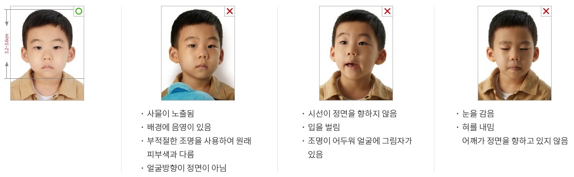 여권사진의 크기는 가로 3.5cm X 세로 4.5cm, 머리 길이는 정수리(머리카락을 제외한 머리 최상부)부터 턱까지 3.2~3.6cm 사이인 사진을 제출해야 함