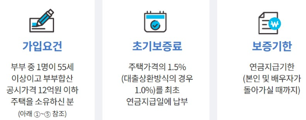 주택 연금의 가입 조건은 3가지가 있는데요. 부부 중 1명이 55세 이상이어야 하고, 담보로 하려는 주택의 공시가격이 부부 합산 기준 9억 원 이하여야 해요. 물론, 실제로 주민등록 전입한 거주지여야 하고요.
